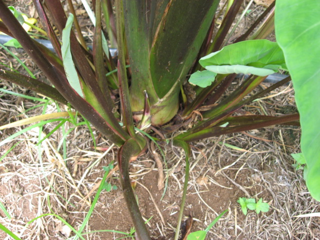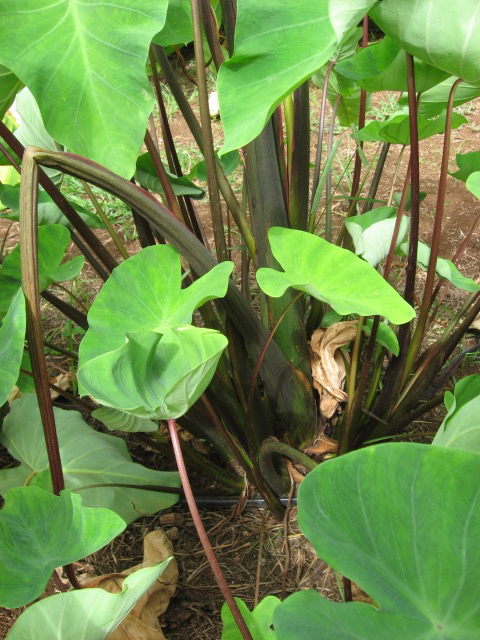 Lauloa Palakea Papamū: Lauloa is like a long wave, maybe refers to the long leaf. Papamū is a stone for a Hawaiian game similar to checkers. This is a native variety of comparatively recent origin, probably originating through natural genetic mutation. Palakea refers to the soft, white consistency of the cooked ‘i‘o kalo (corm).